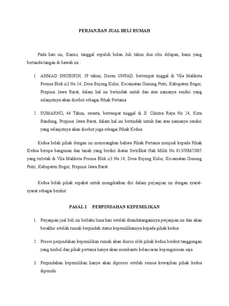 Berikut ini beberapa contoh surat perjanjian jual beli tanah dan rumah beserta cara menyusunnya dengan baik dan benar. Buyer hendaklah sediakan 10% deposit. Contoh surat perjanjian jual beli rumah warisan. Perjanjian jual beli atau akronimnya spa / snp (sale and purchase agreement) ialah dokumen perjanjian jual beli hartanah antara penjual (vendor/seller) dan pembeli (purchaser/buyer) ia merangkumi semua jenis harta tanah bukan terhad kepada rumah sahaja. Jl kecubung 13, jagakarsa, jakarta selatan status perkawinan :