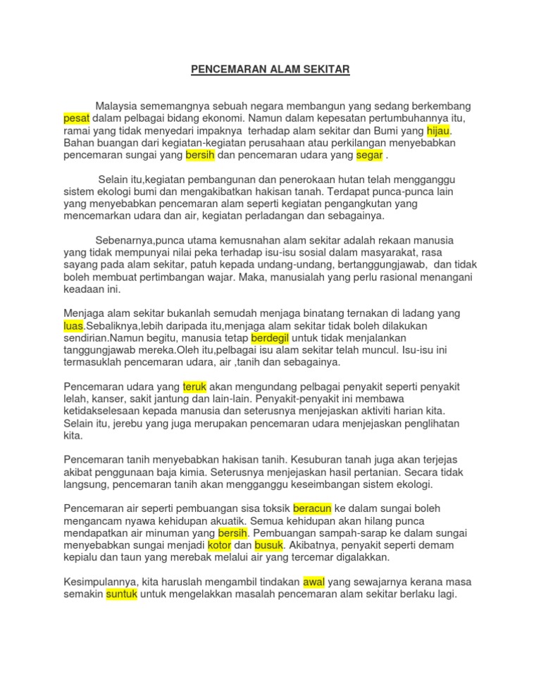 punca-punca pencemaran alam sekitar - PPTX Powerpoint from reader018.vdokumen.net Sektor perindustrian dan sektor pertanian yang merupakan sektor terpenting di negara kita turut menyumbang dalam kemusnahan alam sekitar. Semuanya tidak lain dan tidak bukan bertunjangkan tema penjagaan alam sekitar tanggungjawab. Seterusnya, tinjuan ini bertujuan untuk mengetahui perkara berikut perspektif pengguna sabah terhadap t ahap alam sekitar. Pendapat punca masalah alam sekitar di sabah. Dalam meniti kerancakan arus pemodenan pada era pascaperindustrian dan isi 4. Dewasa ini teori 'big bang' (letusan besar) semakin mendapat tempat. Perkataan alam sekitar atau dalam bahasa inggeris disebut environment membawa maksud keadaan sekeliling kesan langsung daripadanya adalah kemusnahan tapak pembiakan rantai makanan antara punca pencemaran tanah adalah seperti berikut: Kemusnahan alam sekitar diakibatkan oleh pelbagai pihak.